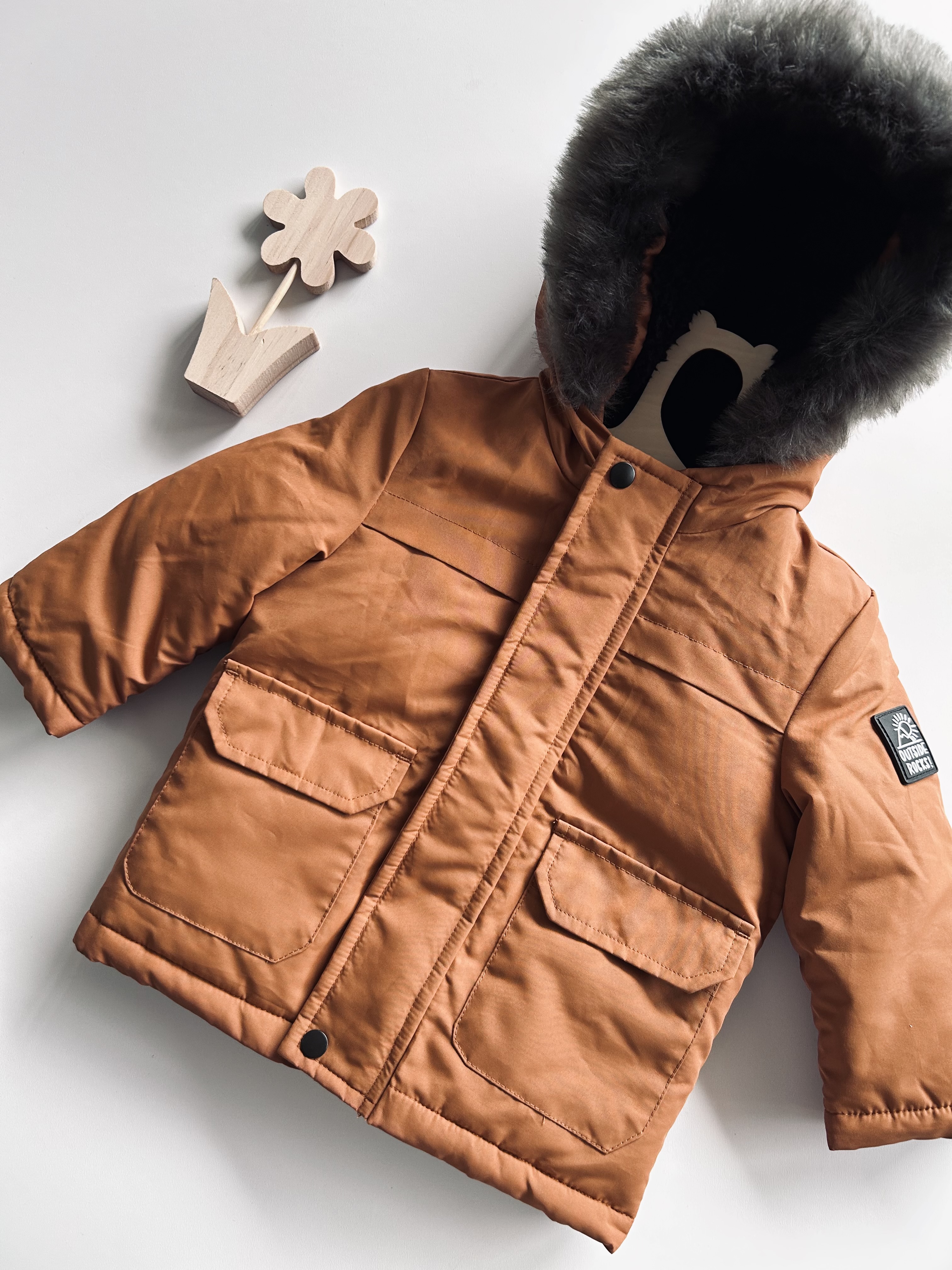 Kurtka parka, kapturek oraz plecki ocieplane misiem. F&F, odzież używana.
