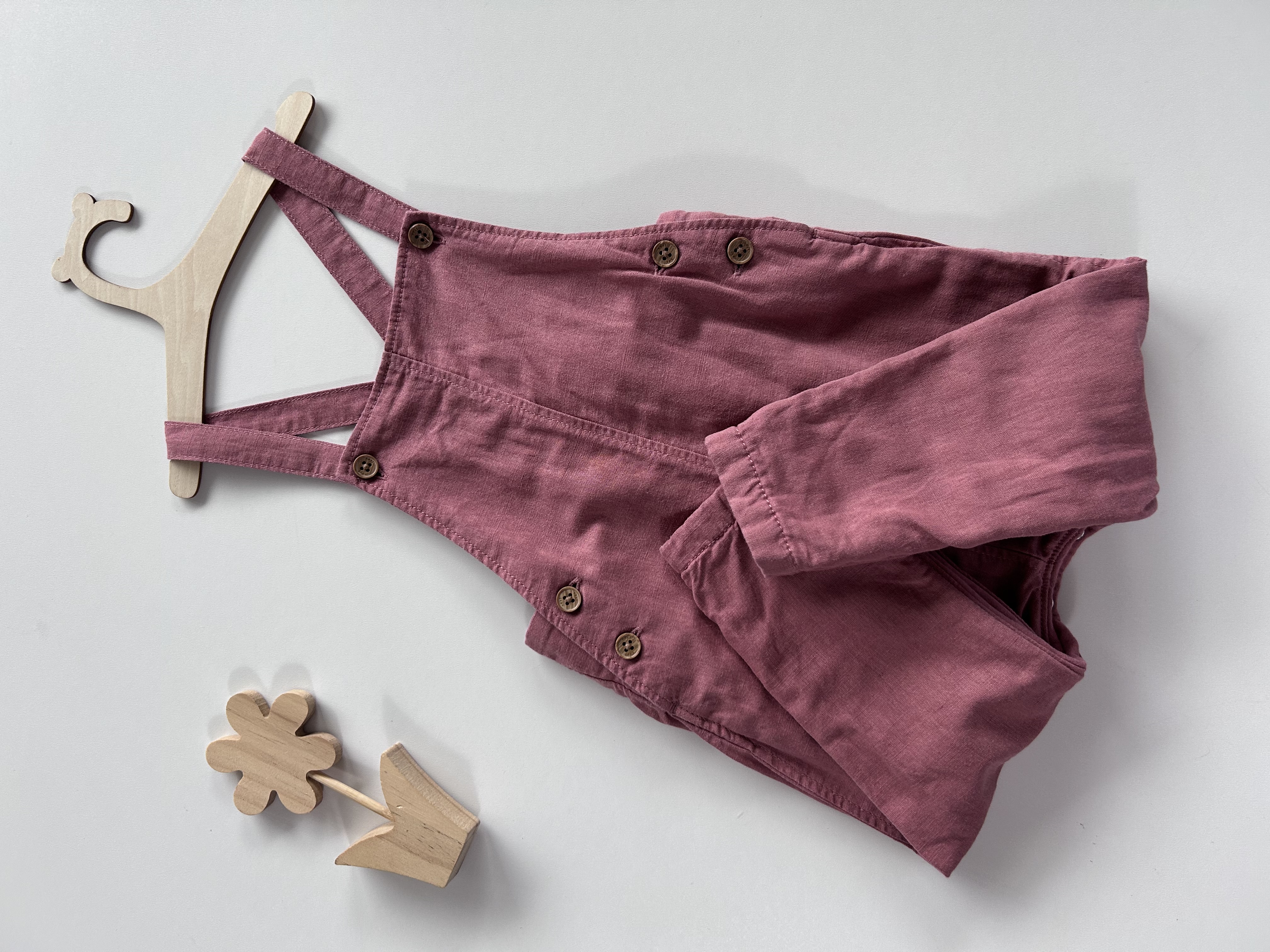 Ogrodniczka, 54% len i 46% bawełna, na podszewce (bawełna). Zatrzaski w kroczku. Next, odzież używana.