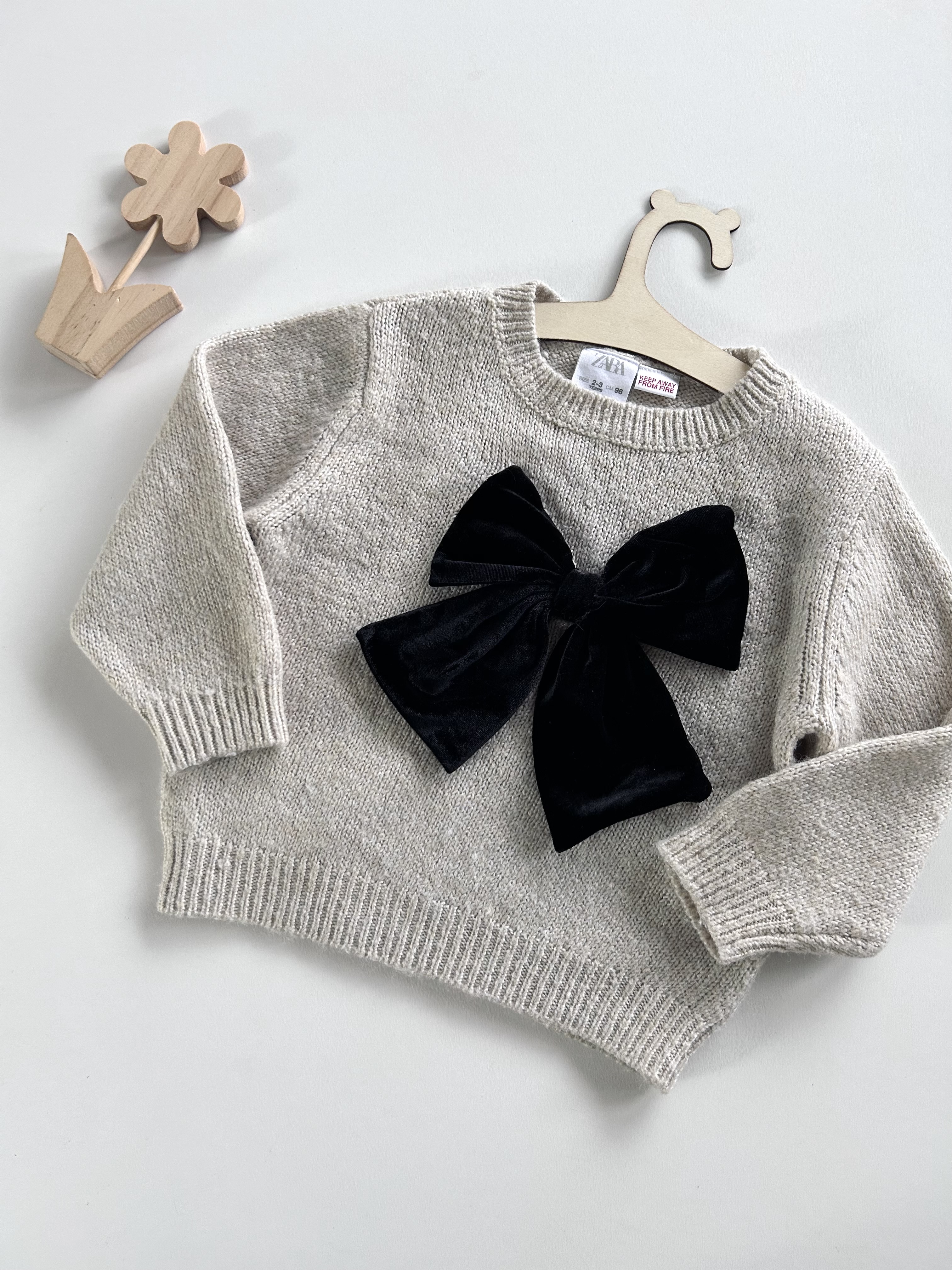 Sweterek z welurową kokardą, domieszka wełny. Zara, odzież używana.
